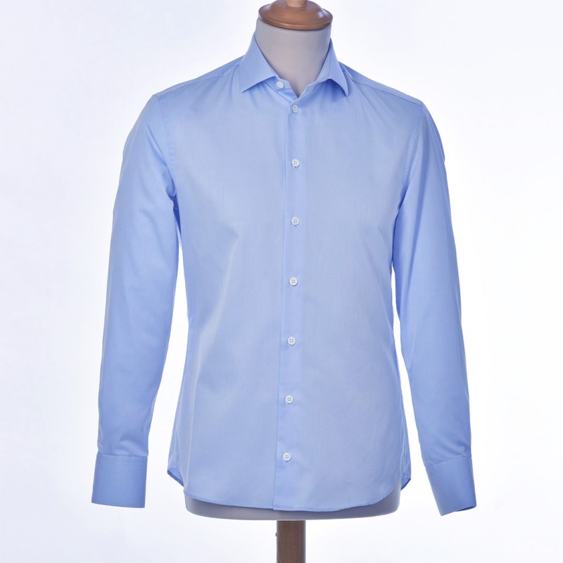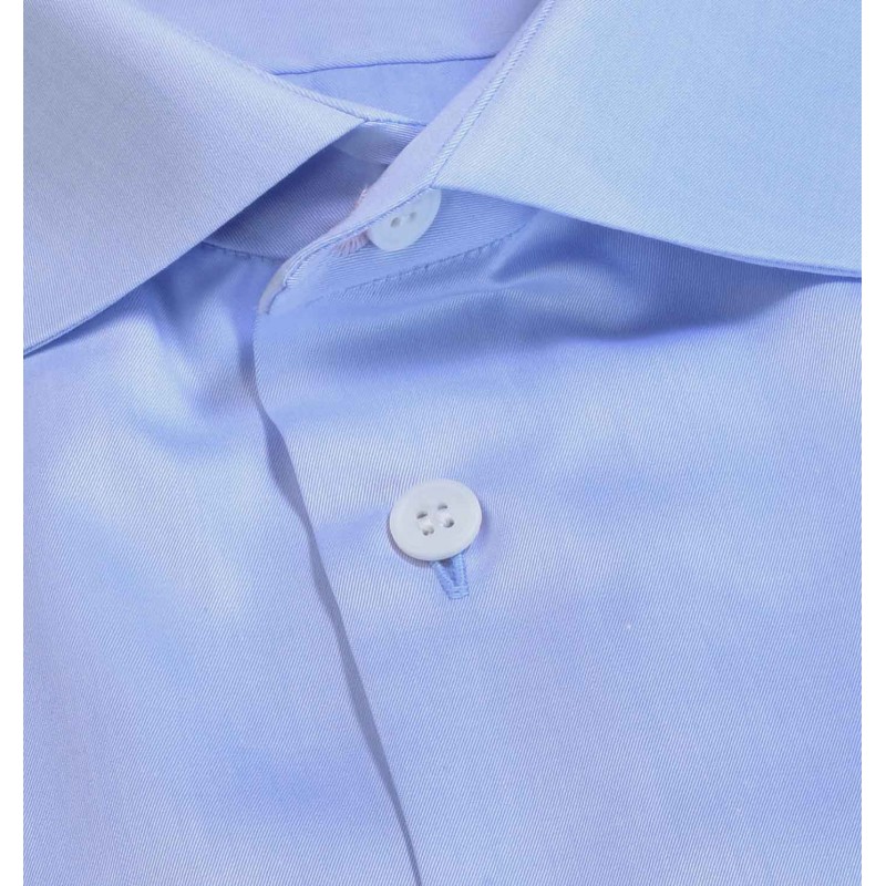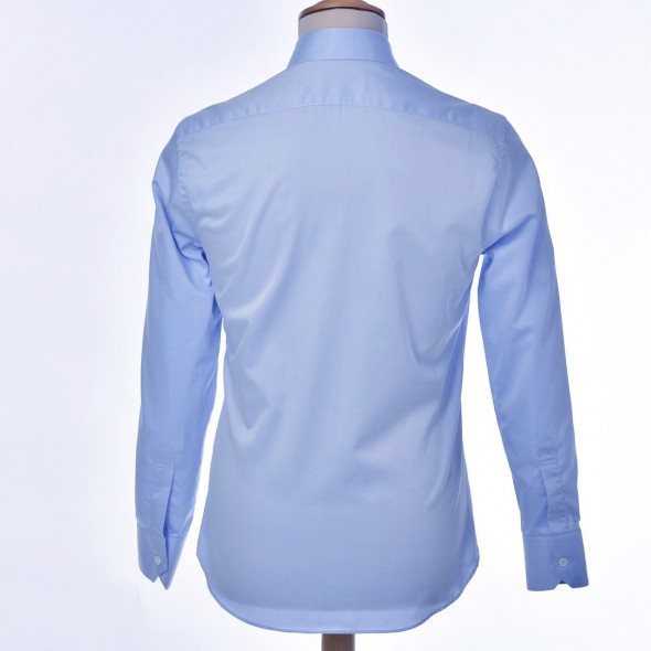 Cette chemise en popeline bleu ciel sera ajustée à votre silhouette, sans être pour cela totalement slim fit.
