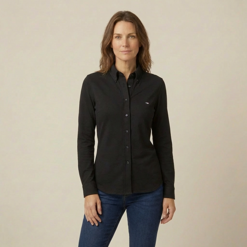 Le chemisier Faustine en coloris Orage, tricoté dans les Vosges, offre une teinte subtile et moderne, parfaite pour structurer une tenue. Ajusté avec précision, il met en valeur la silhouette tout en conservant un confort souple et un style chic et dynamique.