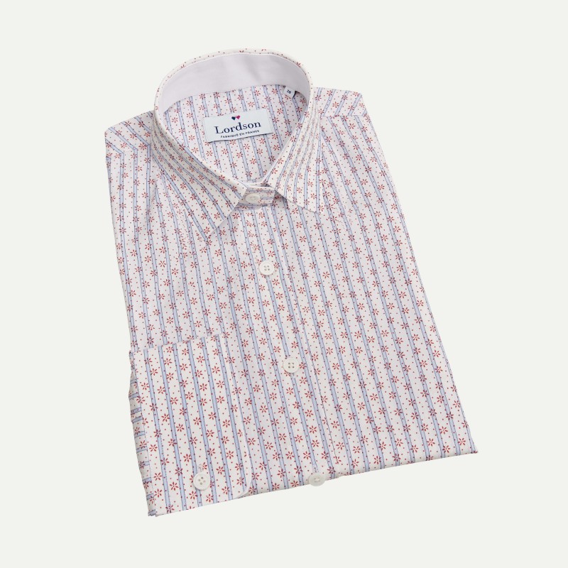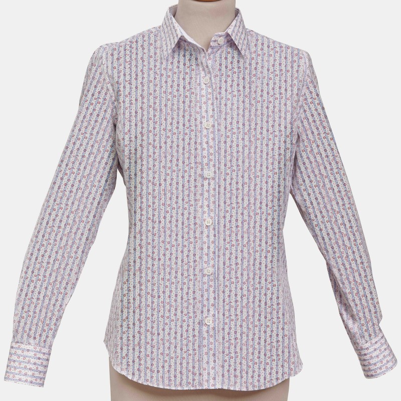CHEMISIER FEMME LADY RAYÉE BLEU OPPOSITION FLEURS ROUGES ET BLANCHES