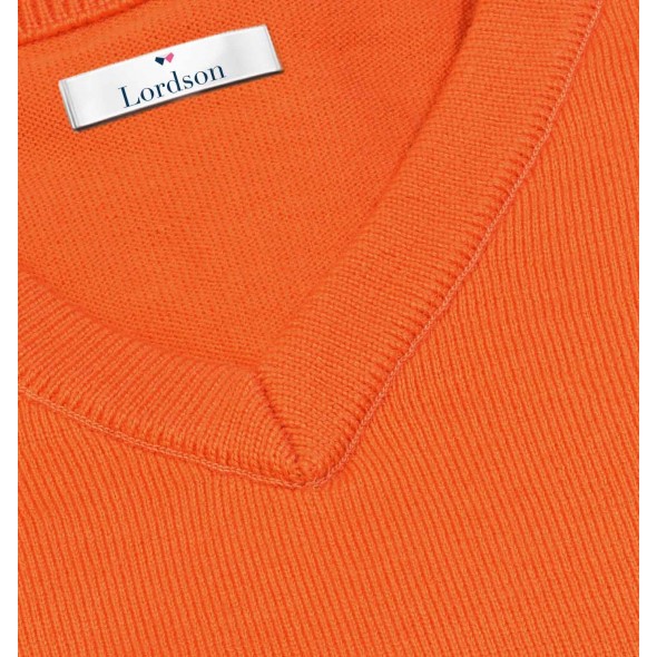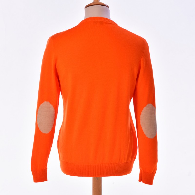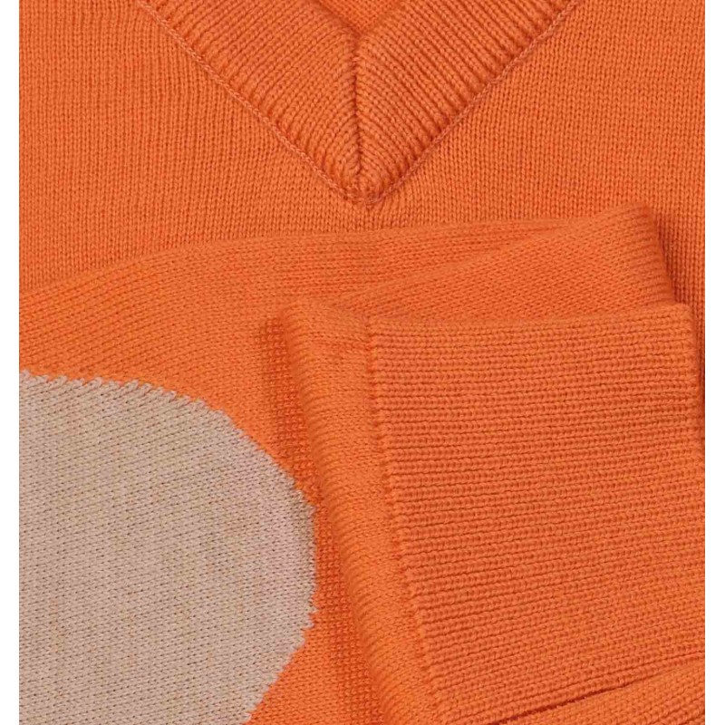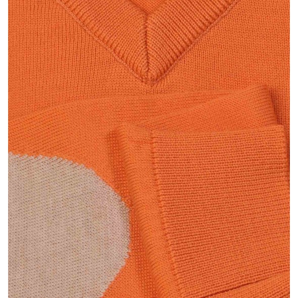 Pull petit col V orange avec coudières beige, incontournable dans votre vestiare.
