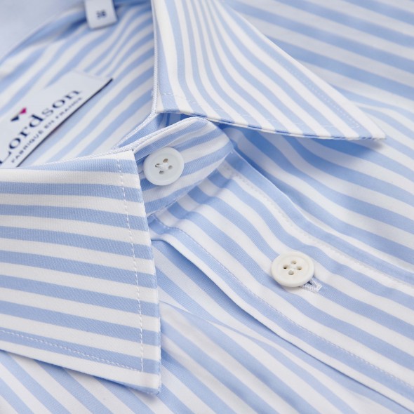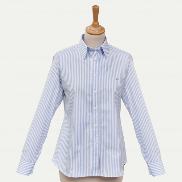 Cette magnifique rayure baton dans ce bleu ciel, sobre et lumineux, son tissu blanc en opposition que vous retrouverez au niveau des intérieurs poignets et col, sauront vous combler.