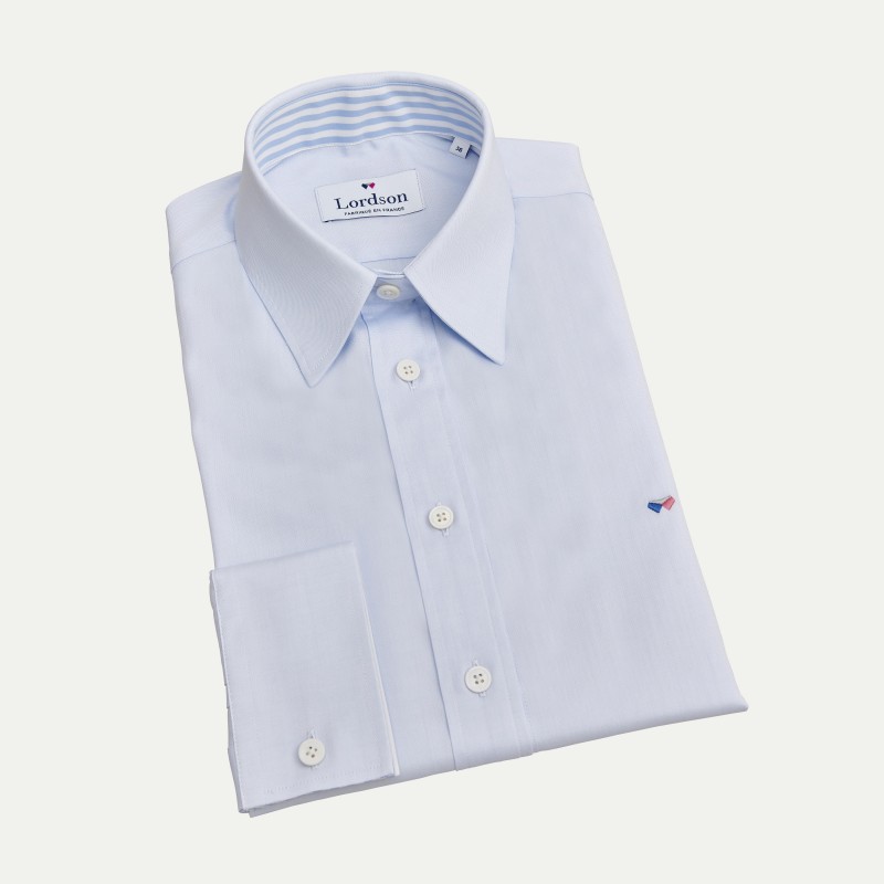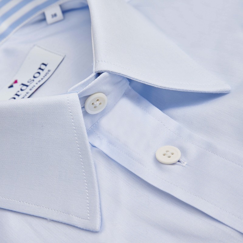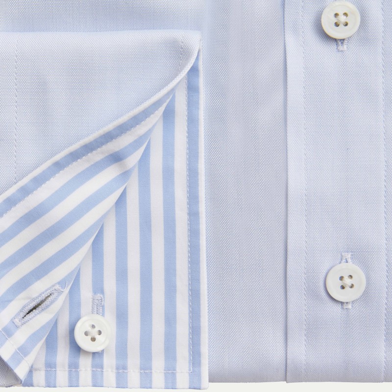 Réalisé dans notre oxford bleu ciel, avec en opposition une rayure bleu ciel que vous retrouverez au niveau des intérieurs poignets et col, sauront vous combler.